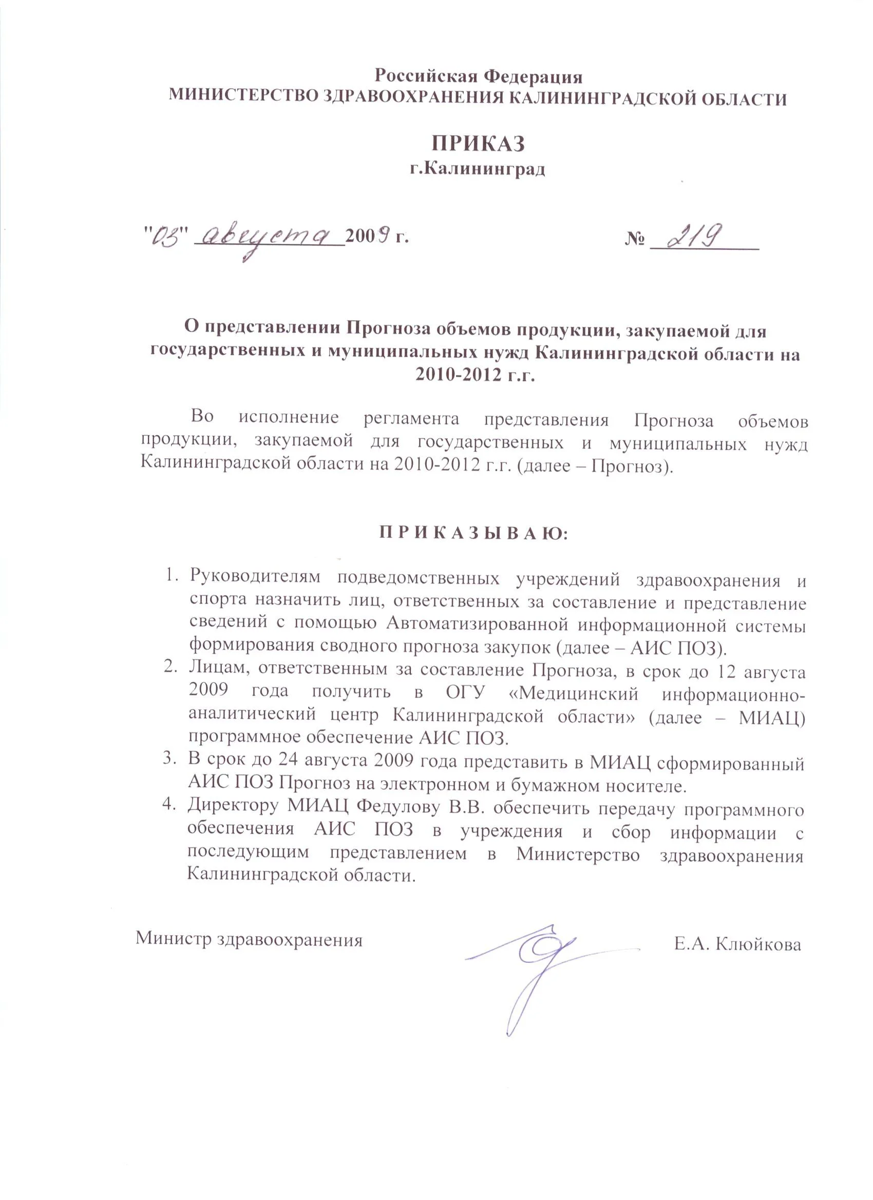 | Приказ Министерства здравоохранения Калининградской области от 3 августа 2009 г. №219 Опубликован 07.08.2009 |